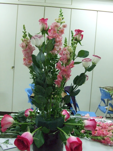 3.取金魚草3枝,修剪桔梗花3支較長的,插於最高點與周圍6枝玫瑰所形成的三角形線上但略高一點,金魚草與桔梗花相間隔插,均插在周圍玫瑰花上